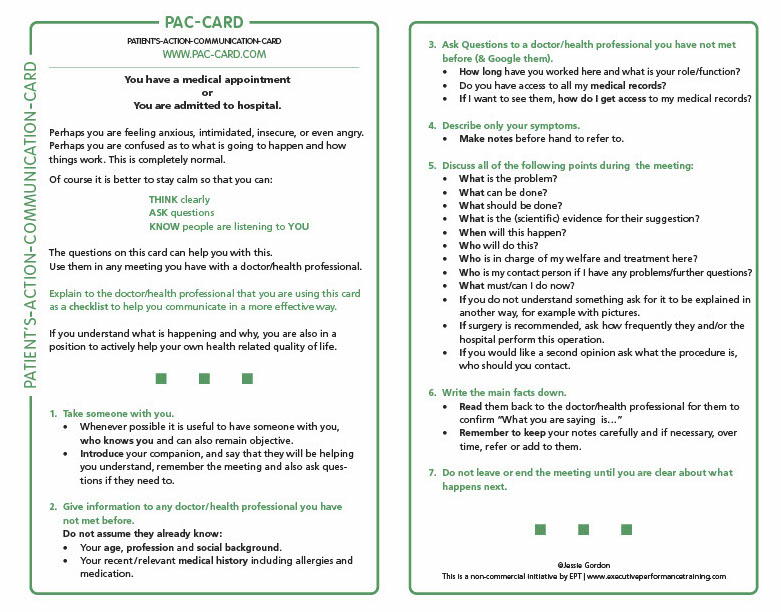 The PAC-CARD is a repeatable checklist with a simple structure to encourage clear, open and time efficient communication.